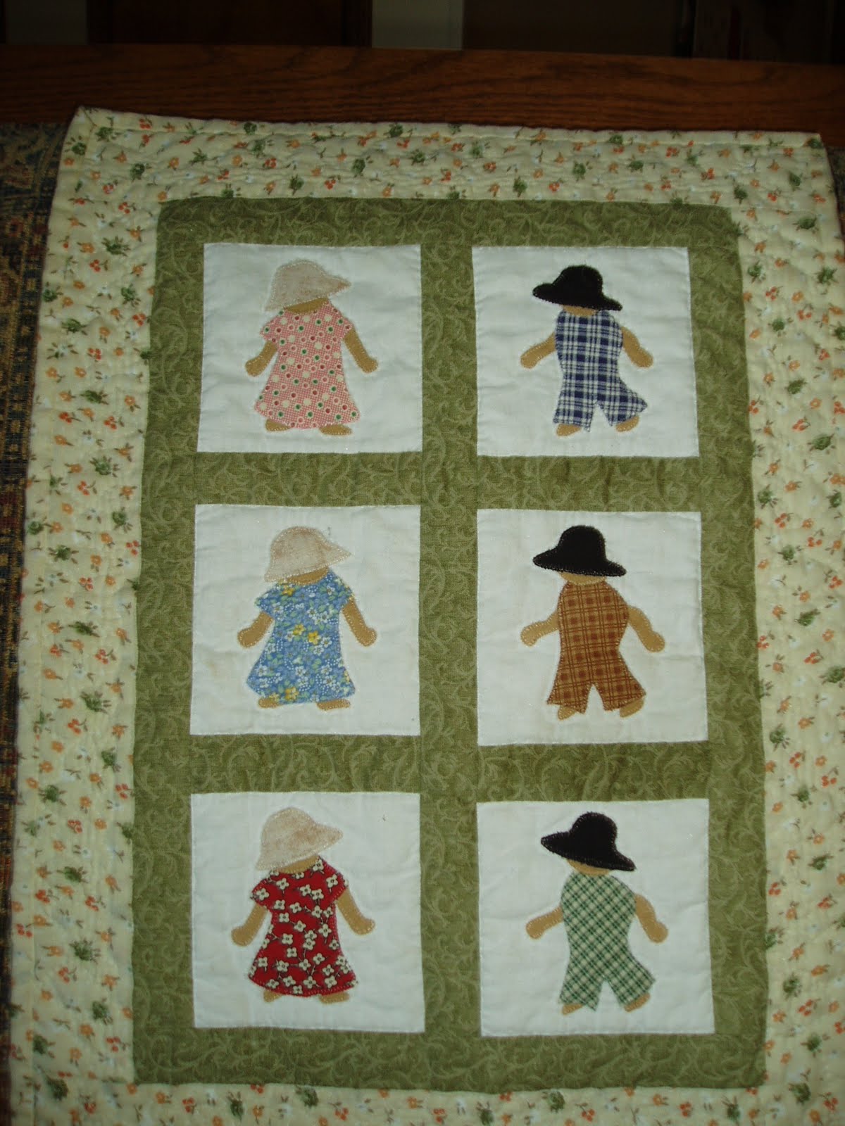 This pattern I simply took from the book, A Quilter's Companion, put it into the copier and reduced it to fit a 4" block. It is an old pattern called "Recollect and Remember". The little figures are hand appliqued with the blanket stitch. I gave it to Brandie.I'll share more doll quilts with you later. They're lots of fun to work with and nice to place around the house.