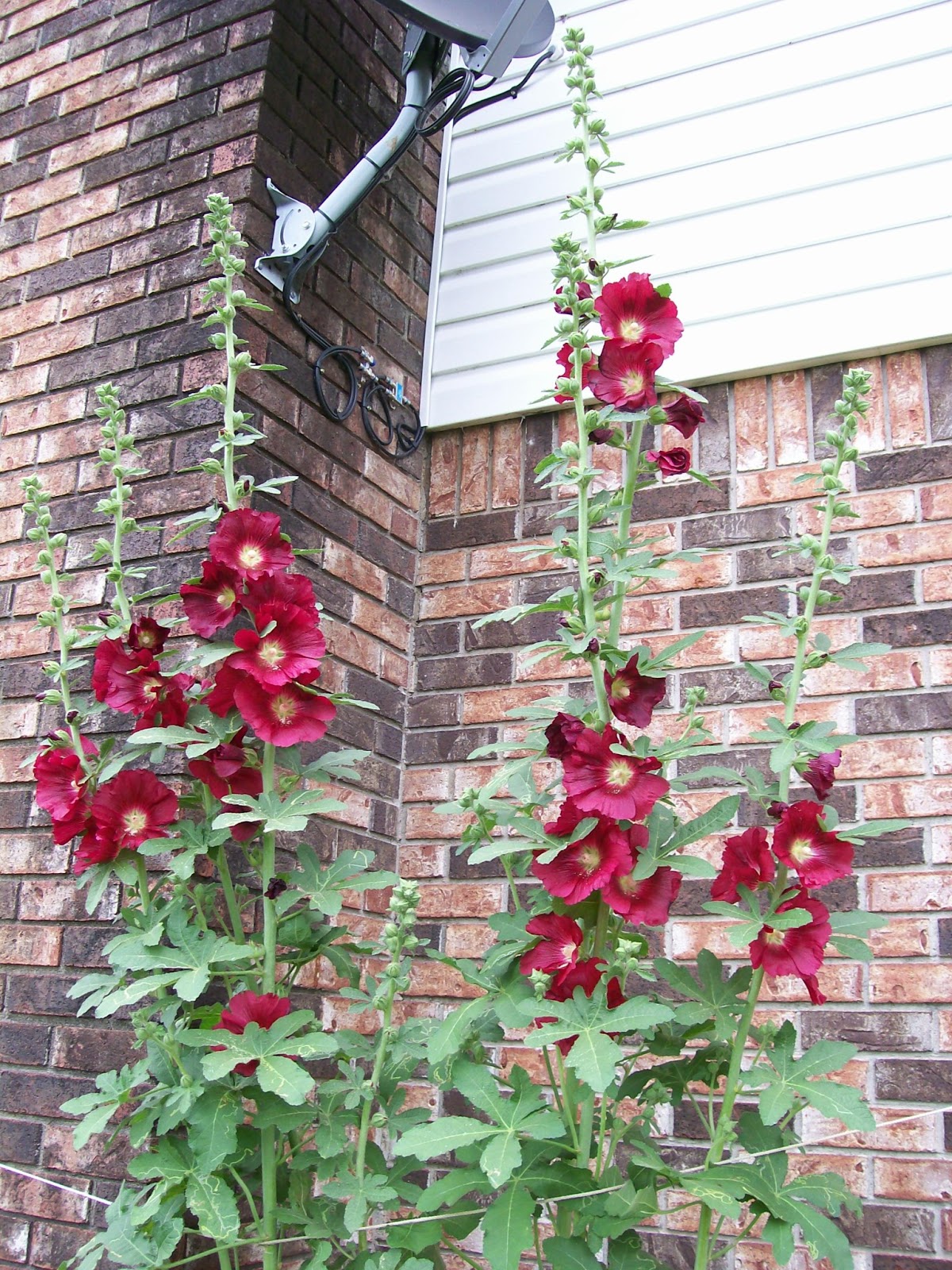 have always been one of my favorite flowers, but I've never had very good luck in growing them. The seeds usually germinate quickly, then the weather turns dry and the seedlings perish. And if they do live, whenever their long stems are heavy with blooms, and a strong wind and rain comes, they fall over and are ruined. It seems they do best growing up next to something, like an old shed or fence, anything to give them a little protection. This year I had a clump growing in a corner between a chimney and a wall. As you can see they grew really tall and we tied a cord to support them.